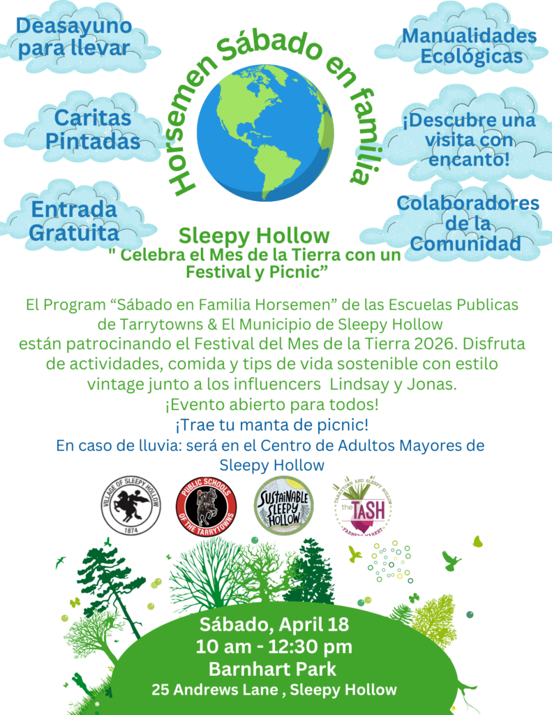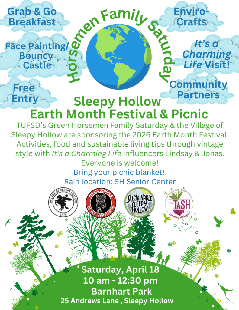 The Village of Sleepy Hollow and TUFSD are co-sponsoring the combined Earth Month Festival/Green Horsemen Family Saturday for residents of both villages at Barnhardt Park. TUFSD is providing a grab & go breakfast with food donated by The TaSH Farmers Market. Kids can do environmental crafts, get their face painted, or enjoy a bouncy castle.